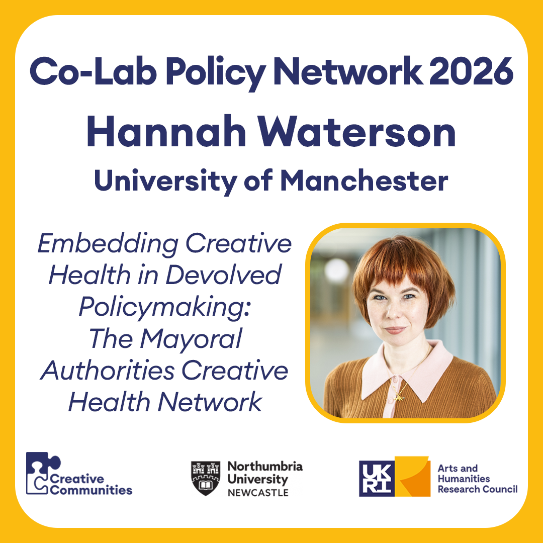 We are delighted that The University of Manchester has received funding through the Creative Communities programme for The Creative Health Policy Co-Lab, working with the Mayoral Combined Authorities. This research, led by Dr Hannah Waterson and Dr Simon Parry, supports a collaborative forum across England: it follows on from The University of Manchester’s strong strand of Creative Health work and will facilitate cross-sector collaboration and establish new links between research and policy through the Mayoral Authorities Creative Health Network.